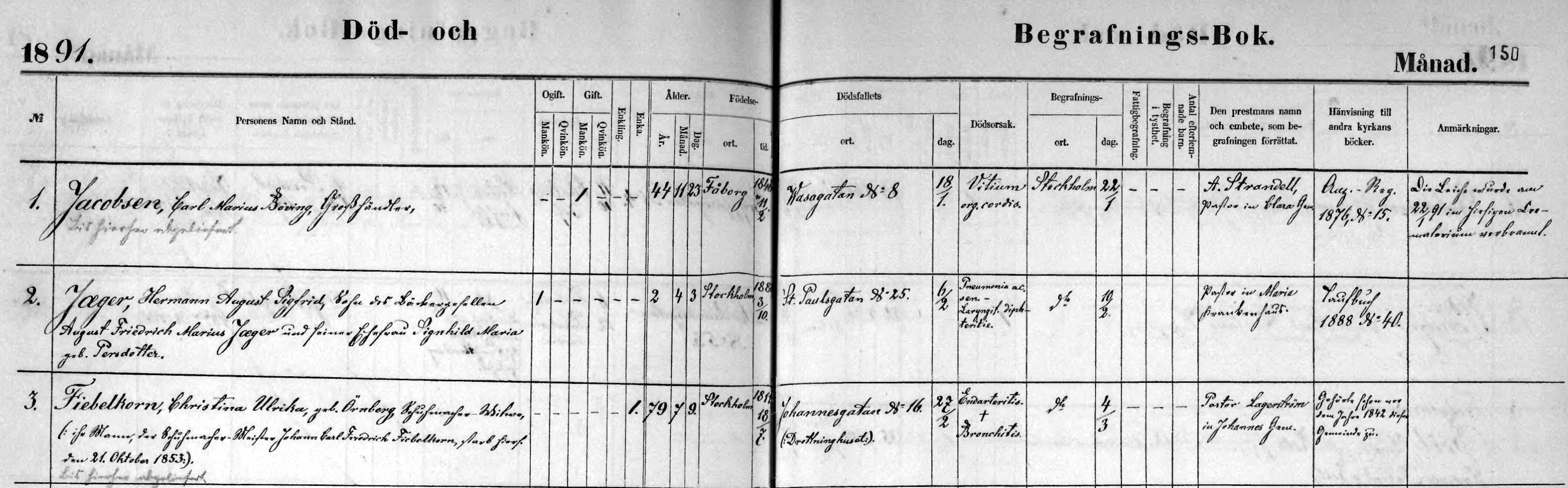 Christina Ulrika Fiebelkorn i Tyska församlingens dödbok 1891.